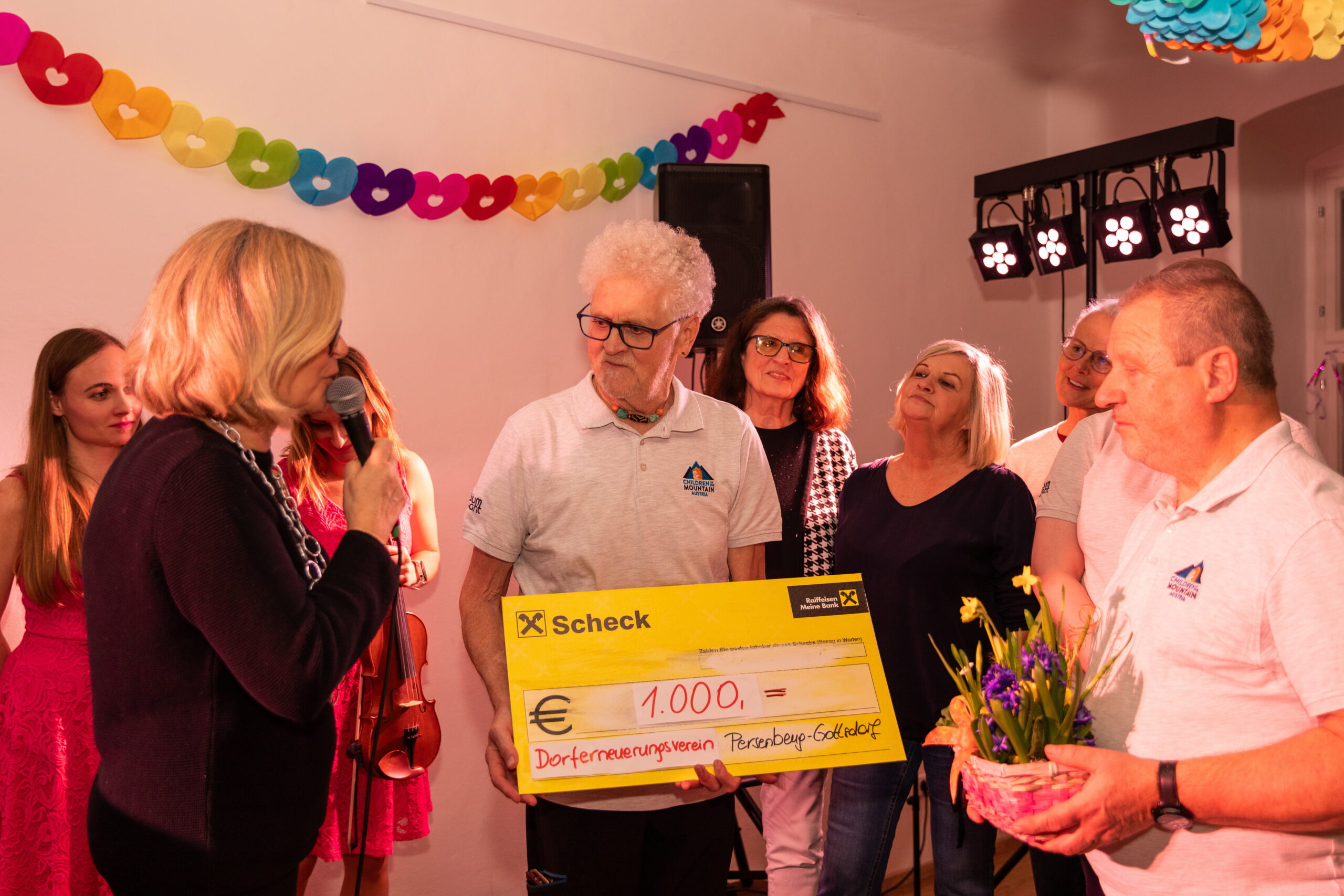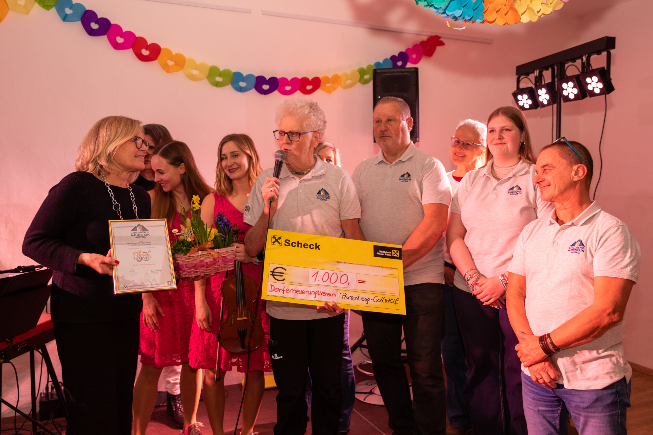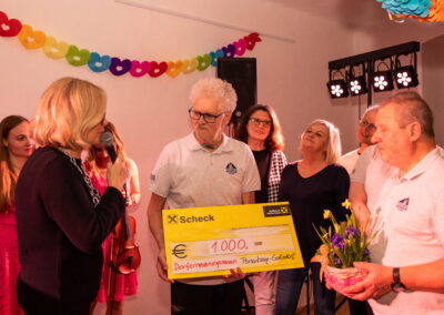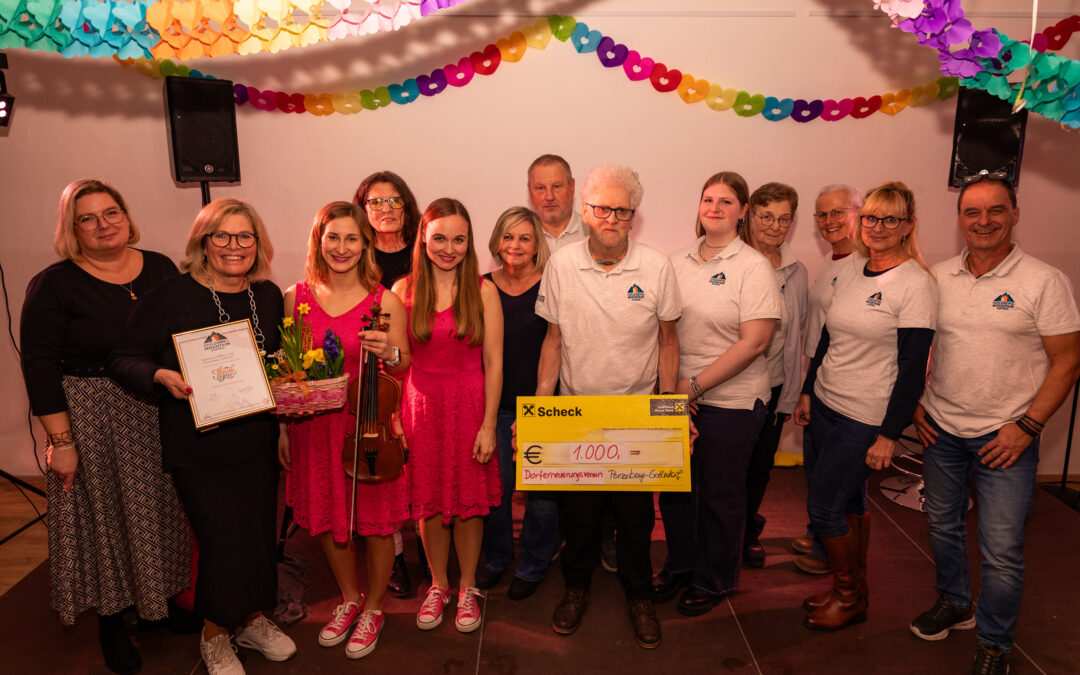 Die beiden Künstlerinnen Johanna Wutzl und Magdalena Pichler von „Natürlich Pink“ begeisterten das Publikum mit ihrem mitreißenden Programm und sorgten für beste Stimmung. Nach dem gelungenen Abend übergab die Obfrau des Dorferneuerungsvereins, Dr. Christa Kranzl, gemeinsam mit ihrem Team eine großzügige Spende in Höhe von 1.000 € an „Children of the Mountain Austria“.